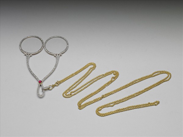 眼鏡一柄,鏡片平整光潔,薄而透明,鑲於雙圓框,連附於Y型托柄,鏡框及鏡柄鑲飾小鑽,托柄可左右伸縮活動,便於調整配合雙眼間距。鏡柄下端呈繞環形,鑲紅寶石,連綴鍍金長鍊,可供佩掛攜帶。此件原配製絨盒內有Gebr. Friedländer Hof-Juwellere Sr. Maj. d. Kaisers, Berlin W.戳印,可知為來自十九世紀德國皇室專屬珠寶工坊的製品。