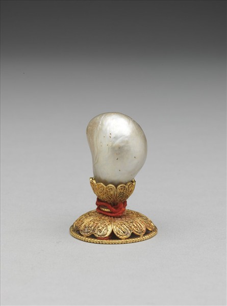 鑲珠冠頂,銅鍍金座飾纍絲花紋,座上嵌珍珠,珍珠表面有些許斑點,帶虹暈。