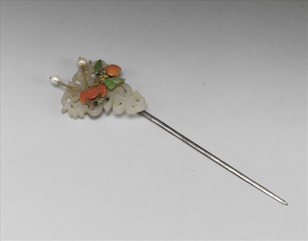 髮簪,簪首玉雕「壽」字為底座,上另固定珊瑚蝙蝠和桃實,有「福壽萬代」的寓意。蝙蝠觸角各穿珍珠一顆,尾端點翠,旁為珊瑚桃實,葉片鑲綠色玉石。素扁鋌。