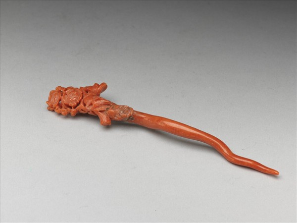 簪前段雕成竹節狀,頂端雕飾纏枝花卉,下刻有蟬憩息於枝葉中,簪挺彎曲。