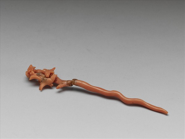 簪前段雕成竹節狀,頂端雕飾松與展翅向下翱翔的鳥,簪首有孔及殘斷,簪挺彎曲。