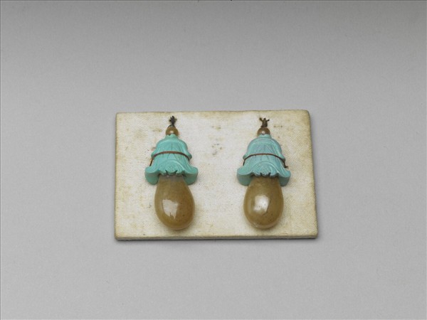 耳墜一對。玉墜為水滴形,上有綠松石寶蓋為飾。