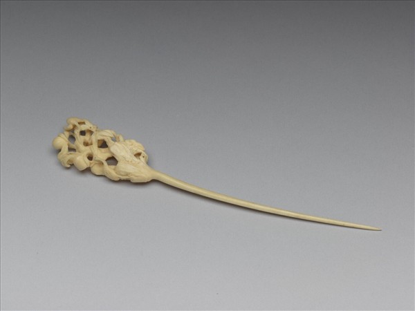 簪首鏤空雕雙鶴一上一下相對停佇於枝葉,雕工細緻有祝賀長壽之意,簪挺扁錐形,尾尖。