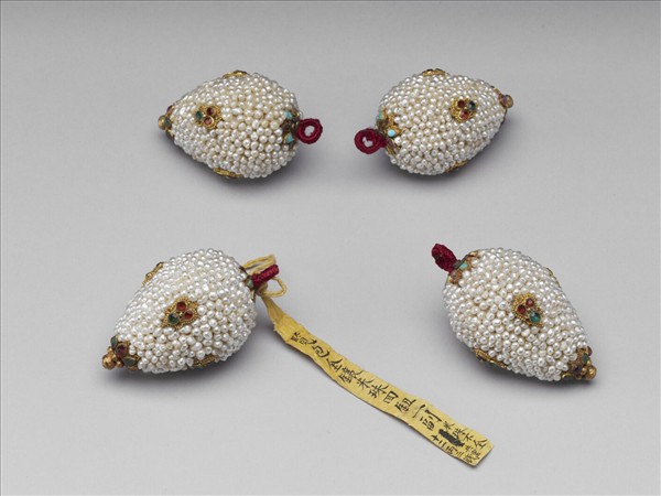 椎形鈕子一組四個,通體砌米珠,嵌有紅、綠料石三個為一組,尖端與底端飾紅色料石四,掛環纏紅絲線。