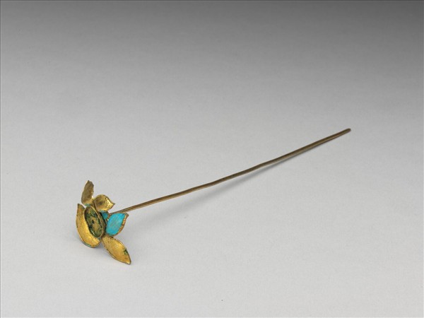 髮簪,簪首呈花形,鑲飾寶石脫落,點翠花瓣。素鋌。