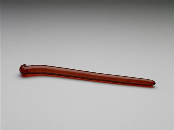 髮簪,通體由琥珀雕成圓條形,簪首作菌傘狀,連接素挺處略彎。此簪造形簡約,琥珀色澤紅潤,顯現出典雅的美感。