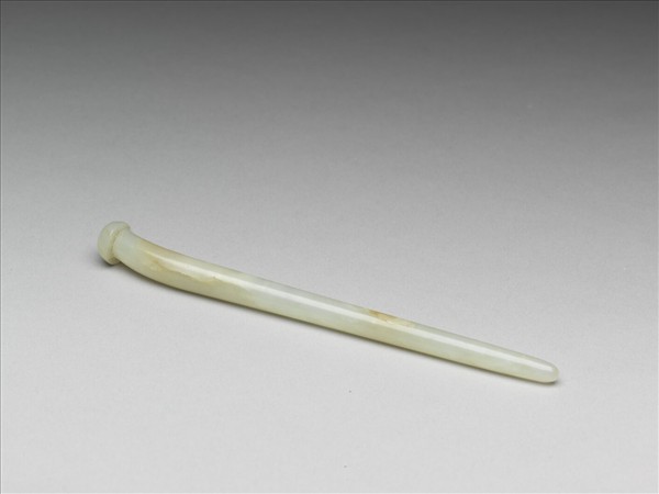 髮簪,通體由硝石雕成,簪首作菌傘狀,連接素挺處略彎。此簪造形簡約,硝石色澤白中泛青,挺處透出黃褐色紋路,顯現出典雅的美感。