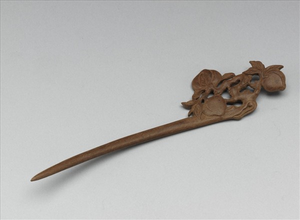 髮簪,通體由肉桂木雕成,簪首單面鏤雕三棵桃實及枝葉。素挺呈優美弧形。