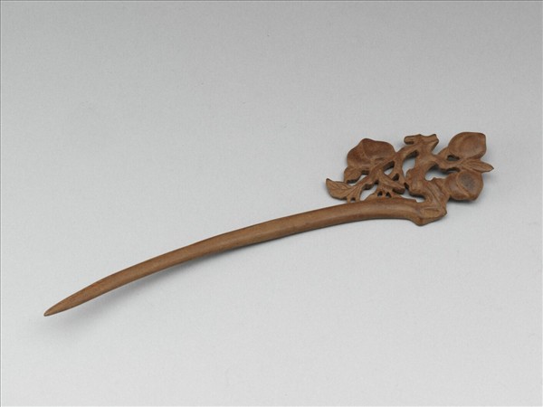 髮簪,通體由肉桂木雕成,簪首單面鏤雕三棵桃實及枝葉。素挺呈優美弧形。