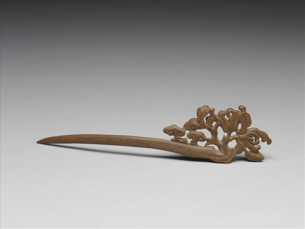 髮簪,通體由肉桂木雕成,簪首單面鏤雕雙佛手及枝葉,佛手與福壽諧音,此紋飾帶有吉祥寓意。素挺呈優美弧形。
