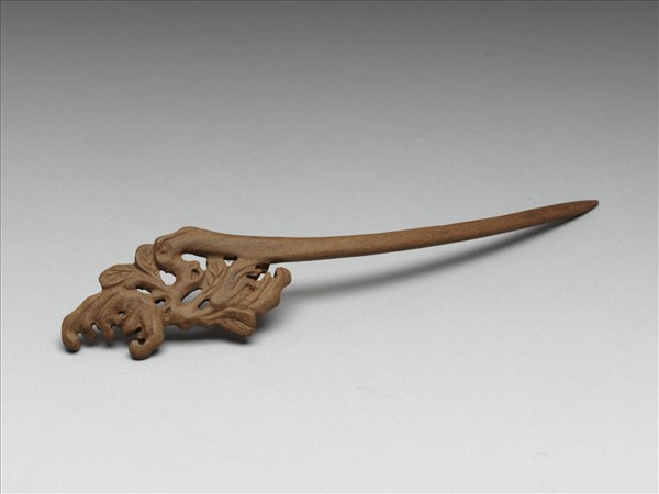 髮簪,通體由肉桂木雕成,簪首單面鏤雕雙佛手及枝葉,佛手與福壽諧音,此紋飾帶有吉祥寓意。素挺呈優美弧形。