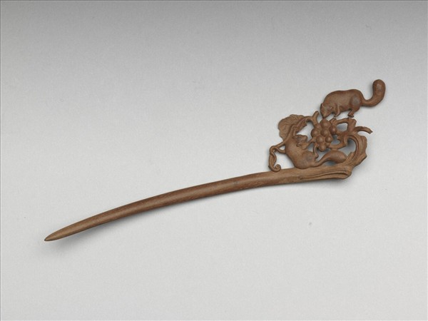 髮簪,通體由肉桂木雕成,簪首單面鏤雕兩隻松鼠、葡萄和枝葉。素挺呈優美弧形。