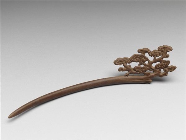 髮簪,通體由肉桂木雕成,簪首單面鏤雕靈芝。素挺呈優美弧形。