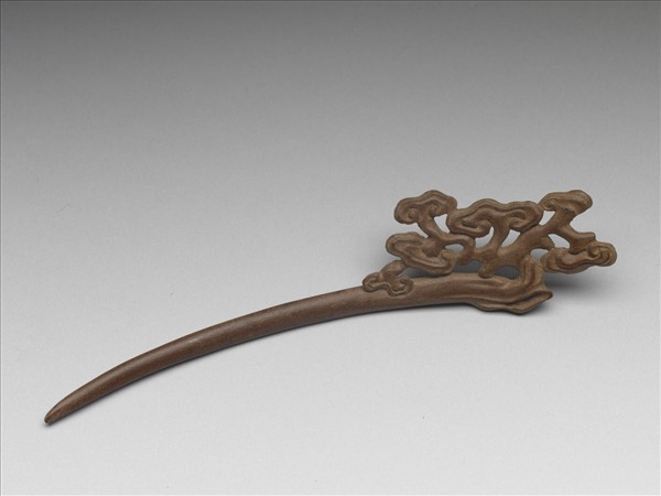 髮簪,通體由肉桂木雕成,簪首單面鏤雕靈芝。素挺呈優美弧形。