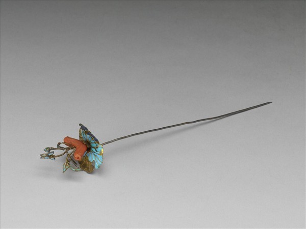 髮簪,簪首飾以藍、紫翠綠補襯之荷葉,葉心鑲一元寶狀珊瑚,點翠荷花及枝葉自珊瑚中穿出。素挺。