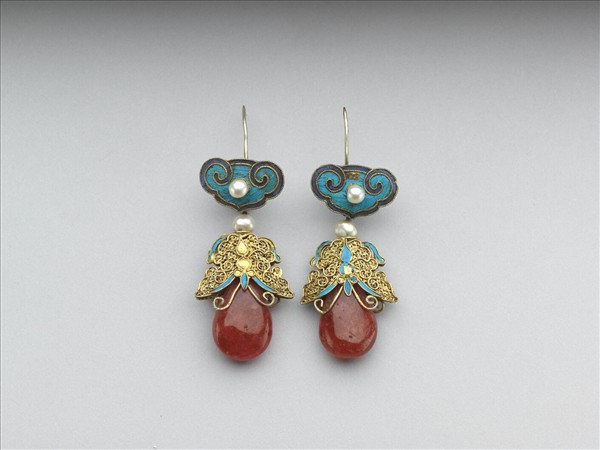 金纍絲嵌紅玻璃耳墜一對,玻璃呈不透明滴珠形,表面有若干孔洞與色彩濃淡色層分布,近似紅色石,留存黃籤記有同治元年(1862)「燒紅石」。墜珠嵌於纍絲點翠蝴蝶形寶蓋,連綴於點翠鑲珍珠如意首及鉤環。