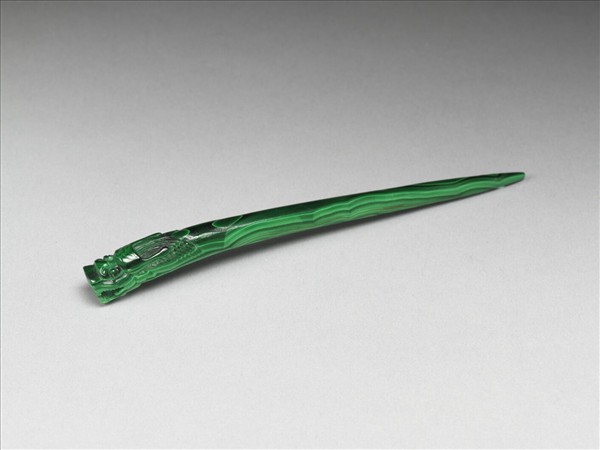 孔雀石雕刻而成素挺簪,厚實如短棒,尾端呈尖錐形。近簪首處微曲,前端雕為龍首形,口部微張鏤空、牙尖相連。通體打磨光滑,色澤依孔雀石自然紋理呈現層次分明深淺不一的鮮豔綠色。