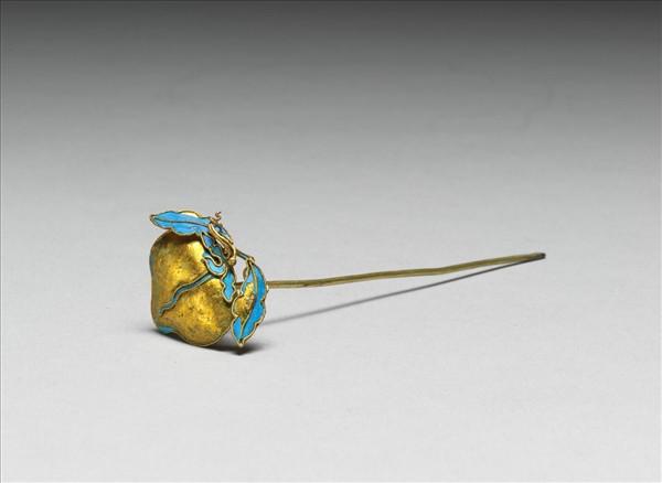 銅鍍金簪一支,挺細長,簪首作桃實形,帶蒂與葉片,桃實部份略具弧度向外隆起,蒂與葉飾以點翠。