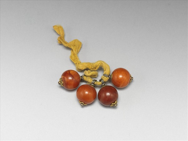 蜜臘鈕子一副,共四顆。鈕身呈球形、渾圓光滑;色澤大致呈暗紅色,深淺不一,表面隱約可見蜜臘紋理。鈕頂接小圓鈕環,底為單層花瓣。
