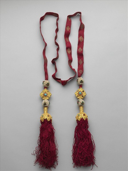 紫線穗一副,編織成細窄長帶狀,夾織淺黃色三層菱形紋;兩端分別貫一金鑲松石花飾,金花飾上下各有一緝米珠結子,末端為金鑲寶石寶蓋連縧穗。金花飾呈四瓣花形,中心鑲有松石一塊,小顆紅寶石環繞在松石周圍。寶蓋呈半開花苞形,蓋頂帶柱,頂面交錯鑲有小顆松石及紅寶石。緝米珠結子以白米珠為地,表面等距緝有紅米珠四顆,紅米珠外又環繞一圈翠綠色米珠。