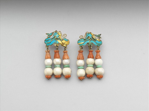 耳墜一副,帶弧狀彎鉤,點翠荷葉寶蓋垂飾珍珠三串, 各連綴珊瑚花托及松石環。附同治二年(1863)黃籤墨書。