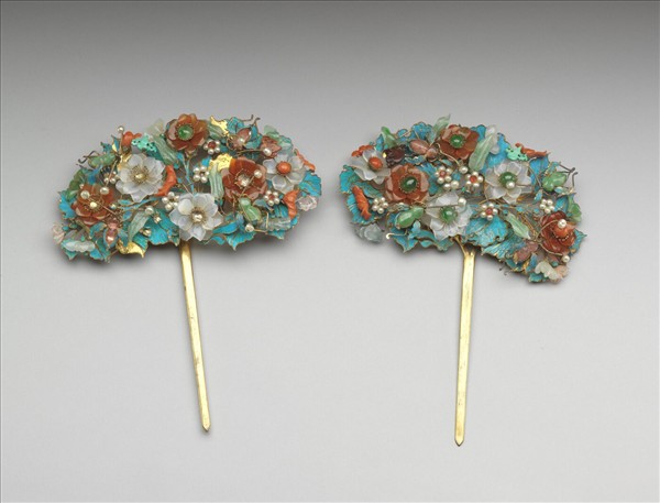 料石花簪一對,兩支形制對稱。鍍金挺扁平而細長,表面光素無紋;尾端尖,近簪首處分叉。簪首呈扇形,飾以珊瑚、白玉、翠玉、粉紅碧璽等各色料石製成之花、葉及昆蟲。一簪上共計有料石花六朵,緝米珠花五朵,昆蟲四隻。料石花為雙層花形,有紅白各三朵,交錯放置;左右兩端花蕊中嵌紅珊瑚,其餘四朵嵌翠玉。緝米珠花為單層五瓣花形,中嵌紅色料石。約在四角處各有一隻昆蟲,分別由粉紅碧璽及翠玉雕成蟲身,安上金屬羽翅、足與觸鬚,觸鬚末端穿米珠,二色昆蟲亦交錯放置。花葉形底座及昆蟲羽翅點翠。全器造型精美,作工細膩。