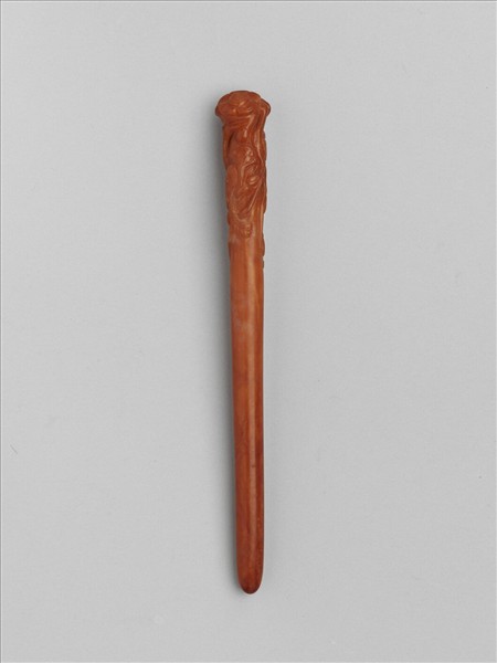 蜜臘雕刻而成素挺簪一支,器身筆直厚實如短棒狀,簪首處飾有五瓣花紋及鳳鳥紋。通體打磨光滑,表面隱約可見蜜臘自然紋理。