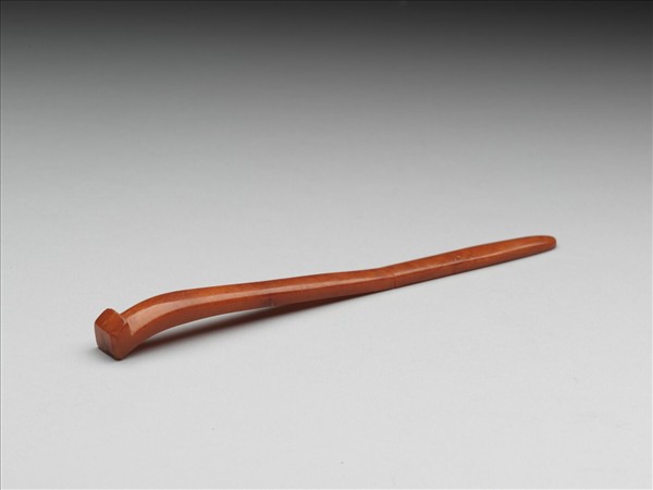 蜜臘雕刻而成素挺簪一支,器身厚實如方錐狀,近簪首處微曲,簪首反折似鉤,全器造型簡約。通體打磨光滑,表面隱約可見蜜臘自然紋理。