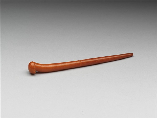 蜜臘雕刻而成素挺簪一支,器身厚實如短棒狀,近簪首處微曲,簪首似圓鈕形,全器造型簡約。通體打磨光滑,表面隱約可見蜜臘自然紋理。