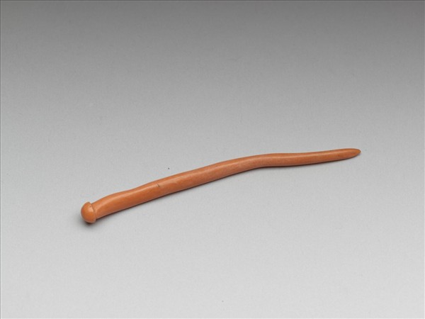 紅珊瑚素挺簪一支,器身依珊瑚原形雕刻而成、呈自然彎曲,簪首似圓鈕形,全器造型簡約。通體打磨光滑,表面隱約可見珊瑚自然紋理。