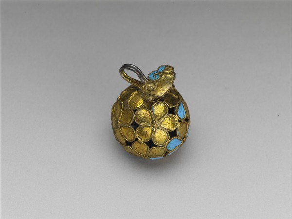 銅質鈕子一個,呈中空球形,由數片五瓣花形飾焊接而成;鉤作如意雲首式。全器點翠。