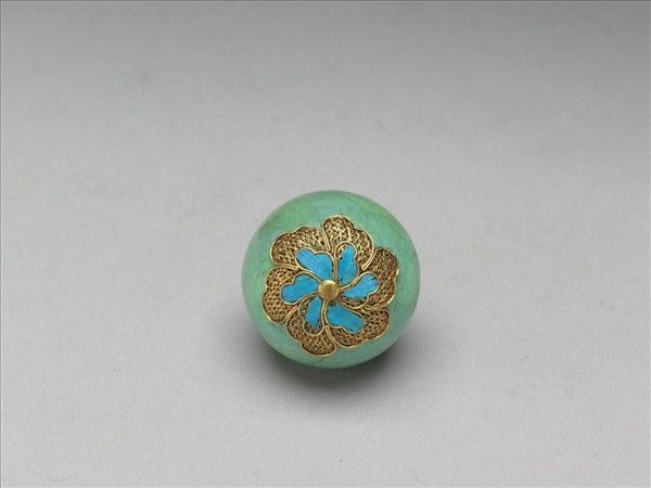 淺綠色松石鈕子一個,鈕身呈球形、渾圓光滑,表面隱約可見松石自然紋理。鉤作如意雲首式,底為雙層六瓣花形,外層花瓣纍絲、內層花瓣點翠,做工精巧。