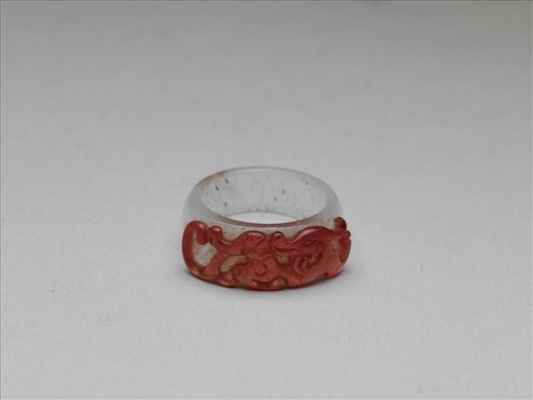 白色玻璃環,戒面黏一紅色玻璃夔龍。