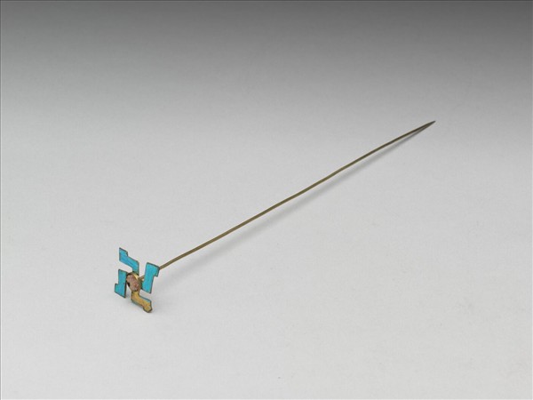 簪,簪首作卍字點翠,原中心有嵌件,現已無存。素挺。