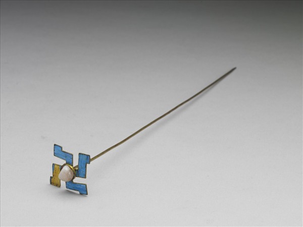 簪,簪首作卍字形飾點翠,中心鑲嵌一粉紅色碧璽。素挺。