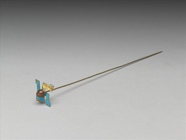 簪,簪首作卍字形飾點翠,中心鑲嵌一碧璽,色澤鮮豔。素挺。