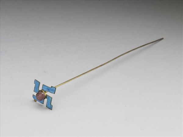 簪,簪首作卍字形飾點翠,中心鑲嵌一碧璽。素挺。
