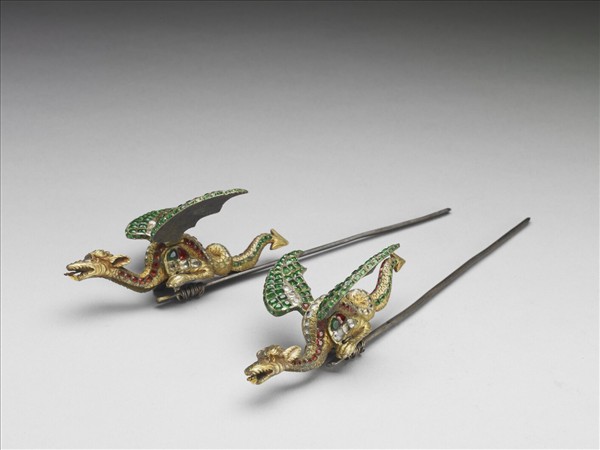 銅鍍金簪一對,簪首鑲昂首吐舌,拱身蹲伏,展翅欲飛之龍形裝飾。龍身與雙翼鑲透明及紅、綠切面玻璃,與鍍金胎體光澤相映。以飛蛇之造型與重量,可能為另一件西洋陳設器或不同功能器物之裝置配件。