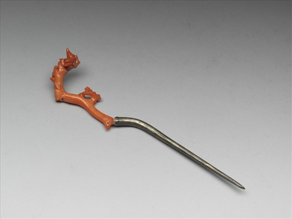 髮簪,簪首為珊瑚枝,順其枝形雕刻花鳥圖樣。簪首鑲嵌在素挺上。