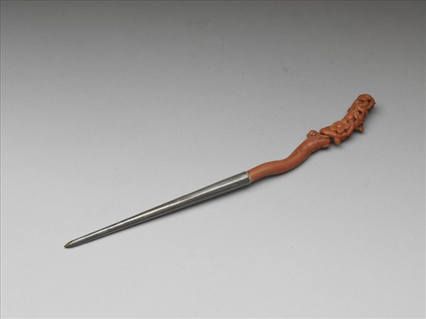 髮簪,簪首為珊瑚枝,順其枝形雕刻梅花圖樣。簪首鑲嵌在素挺上。