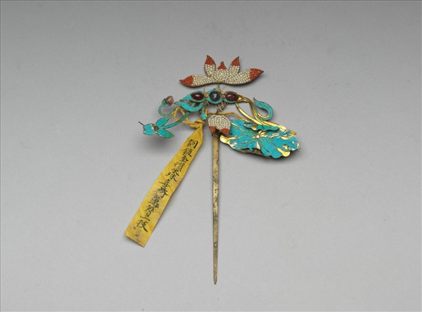 髮簪,簪首作荷葉蓮花形,蓮花鑲嵌珍珠米珠,花瓣尖則鑲嵌珊瑚米珠。中心鑲嵌三顆紅色寶石、青金石,花苞鑲嵌碧璽,枝葉皆飾點翠。簪首以鍍金銅線纏繞在素扁挺。