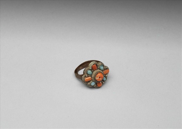 戒指,戒面以八瓣花形為托座,鑲嵌珊瑚綠松石。戒環交錯,大小可伸縮。