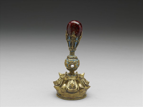 起花銀鍍金座,中番蓮花紋圓球,點翠嵌珠一;最上層銀鍍金蕉葉紋托,銜紅寶石一。座緣有六孔,兩兩相對,可縫於帽上。清制:此朝冠頂凡文一品、武一品、鎮國將軍、郡王額駙和子皆可戴用。