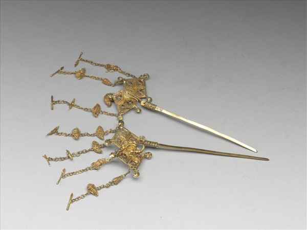 銀鍍金方勝簪一對,簪首為纍絲方勝,上有一纍絲青蛙,各角鑲有一顆珍珠,頂端有四流蘇,以銀鍍金鍊串纍絲瓜果、葫蘆,及蒲扇、刀、戟等雜寶。鋌扁平。
