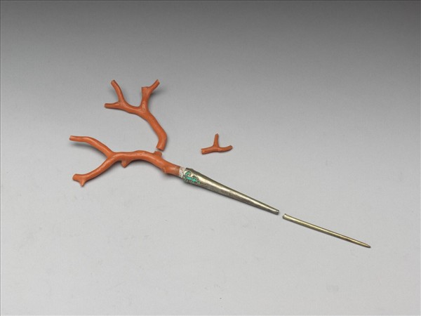 銀鑲珊瑚簪一支,簪挺以銀片捲成圓錐形管,頂端的管孔插入一根珊瑚枝做簪首,管孔旁有點翠如意紋裝飾。