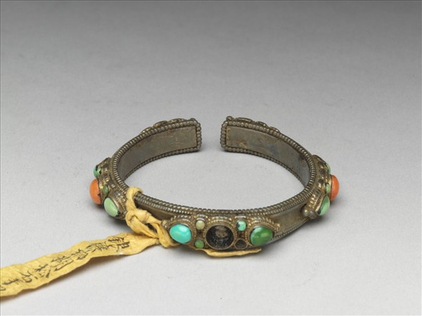 銀手鐲,有開口成玦形。以中央珊瑚珠,兩側圍繞四顆小松石珠及兩顆大松石珠為一單元的裝飾共三組;開口兩側各鑲一顆圓形大珊瑚珠與大松石珠及兩顆小松石珠。嵌座周圍及銀鐲外側周邊鏨刻連珠紋。