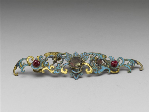 銀鍍金座點翠番蓮紋飾品一件,可能是頭飾(如鈿花)或服裝的一部分。中央為番蓮紋,上有一放射性花蕊狀嵌座,嵌件已失,兩旁延伸出捲曲枝葉,上有一對有著纍絲軀幹及點翠雙翅的蝙蝠,兩旁各嵌有一顆紅色寶石。