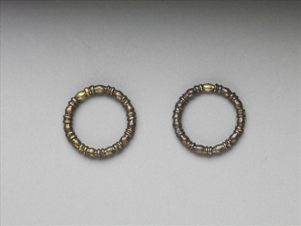 銀鍍金戒指一對,造型如串珠,如橄欖形珠與圓環形珠串連狀。