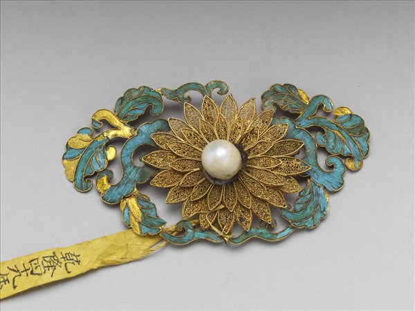 菊花飾件,兩層纍絲花瓣,花心鑲嵌珍珠一顆,兩側飾點翠卷葉。