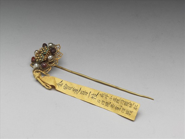 簪一支,做蓮花及蓮蓬造型,底層以金絲盤繞出蓮花瓣,上層中央做花蕊及兩只蓮蓬,蓮蓬上以金珠代表蓮子,周圍舖滿翠羽,另有燒紅石及珍珠相間,圍繞花心作為裝飾。鋌圓而光素。